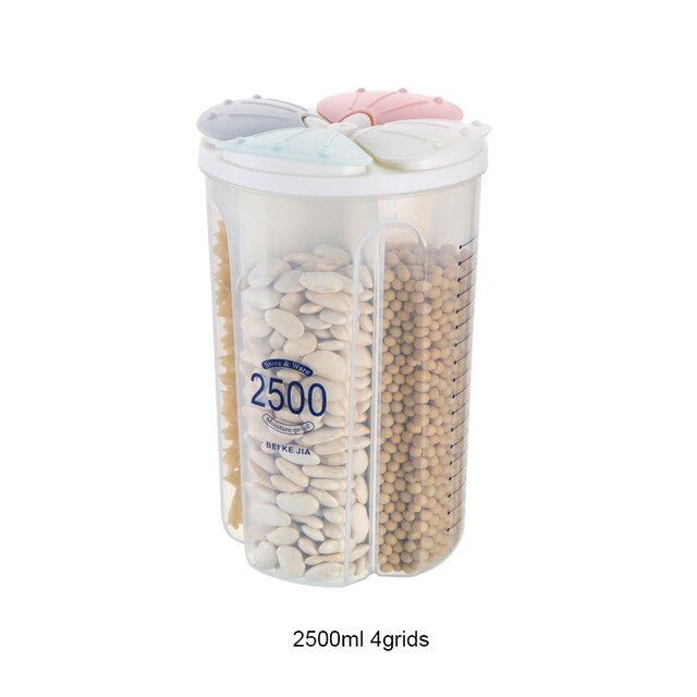 Dies ist ein Behälter zur Aufbewahrung von Lebensmitteln, die z.B für Getreide, Milchpulver, Kaffeebohnen, Tee, Kräuter, Nüsse oder Snacks geeignet sind. Das größte Merkmal dieses Behälters ist die interne Fächer, die je nach Version in zwei, drei und vier unterteilt ist.
